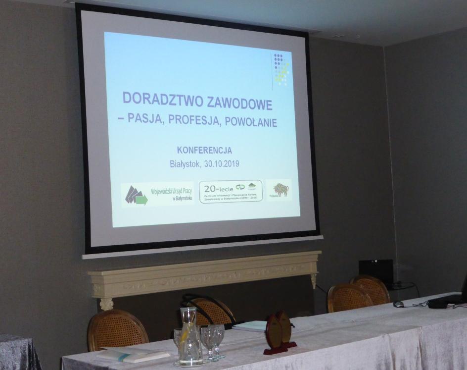 W dniu 30 października 2019 roku w Hotelu Podlasie odbyła się konferencja pt. „Doradztwo zawodowe – pasja, profesja, powołanie", zorganizowana przez Centrum Informacji i Planowania Kariery Zawodowej w Białymstoku z okazji 20-lecia jego funkcjonowania. Do udziału w wydarzeniu zostali zaproszeni doradcy zawodowi z urzędów pracy oraz przedstawiciele instytucji rynku pracy i partnerstwa lokalnego na rzecz promocji zatrudnienia i rozwoju zasobów ludzkich w woj. podlaskim. W konferencji wzięła również udział Pani Naczelnik Wydziału Form Wsparcia Zatrudnienia z Ministerstwa Rodziny, Pracy i Polityki Społecznej. W pierwszej części wydarzenia przedstawiono zagadnienia dotyczące podsumowania działalności Centrum, inicjatyw i dobrych praktyk z zakresu poradnictwa zawodowego w urzędach pracy.
